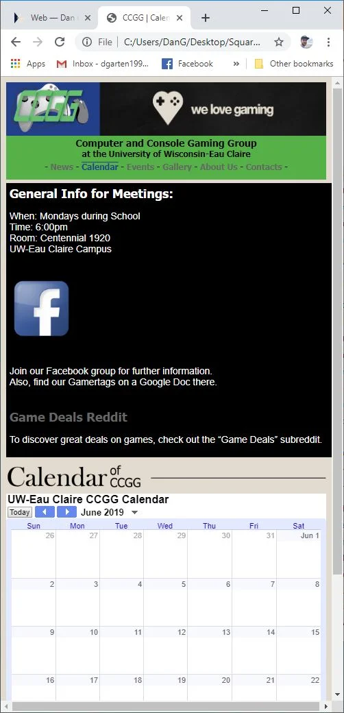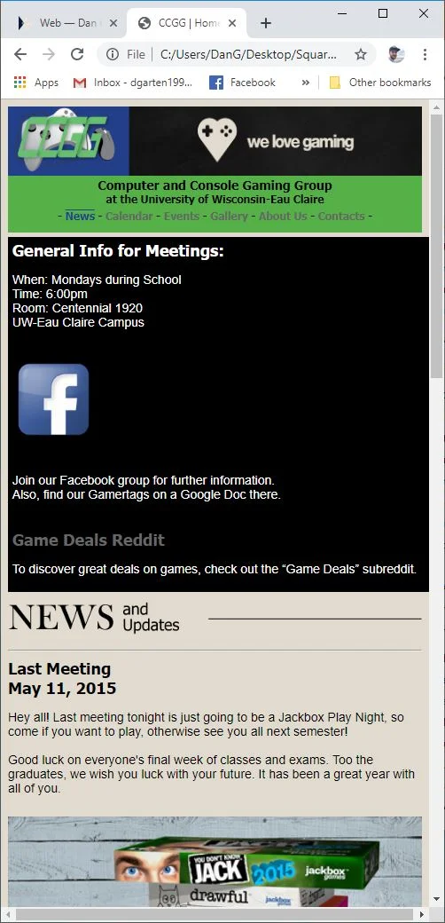 I had created this site fairly quickly as a rough idea of a site we could make for our gaming club at college. The site would serve as a central location for all activities and events happening within the club over the course of the year.